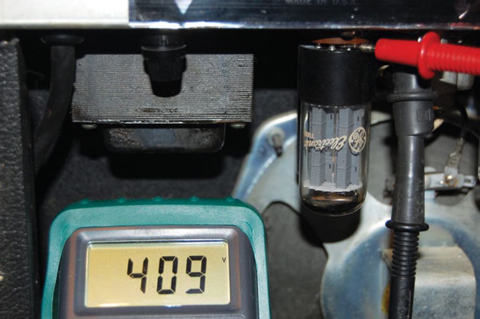 You’ll get a more definitive answer if you measure the voltage at pin 8 of the rectifier tube. Connect the negative lead of a voltmeter to a ground point. (Any point on the chassis will do.) Carefully pull the rectifier tube just slightly from its firmly seated position in the socket, just enough to let the voltmeter’s positive lead touch the pin (Fig. 2). Here you can measure the initial power supply voltage. In this instance, on a unit with the 40 µF cap, you can see I’ve measured 409V DC, which is neither the lower or higher power supply voltage stated on the schematics! Bottom line: It remains a mystery.