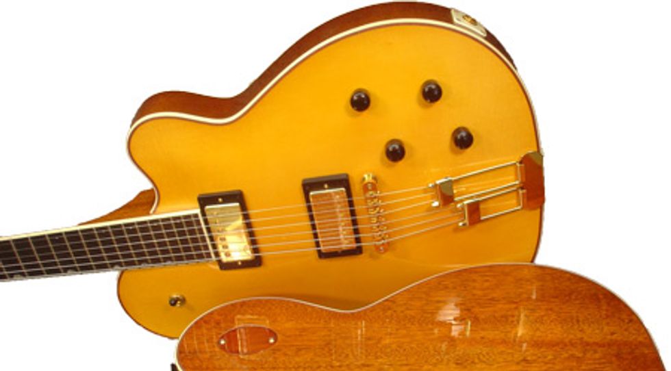 I’ve always loved the carved top—it’s fascinating to me. I like the way it looks, and I’ve always wanted to build one, but I was too busy with NSE guitars. So a couple of years ago I thought I could carve a top and just put it on the same body my NSE has—the mahogany model, which is the hollowed out guitar like Chet played. And it works great. Carving the top is a lot of fun. It adds a third dimension to making a guitar top. If you’ve been making flattops all your life, to start off with an inch-thick piece of wood and end up with a violin-shaped top, that’s a lot harder than slapping some braces on a flat piece of wood. I’m not going to make too many of them, maybe six a year. I just made one for Paul Yandell, a singlepickup carved top electric (CTE).