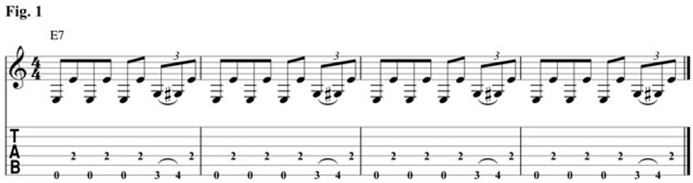 Fig. 2 is a slight variation on the previous pattern. This has a double-stop that’s just on beat 1. I’m taking the 5 (B) and the b7 (D) and sliding in from a half-step below, and then back to the alternating E octaves.