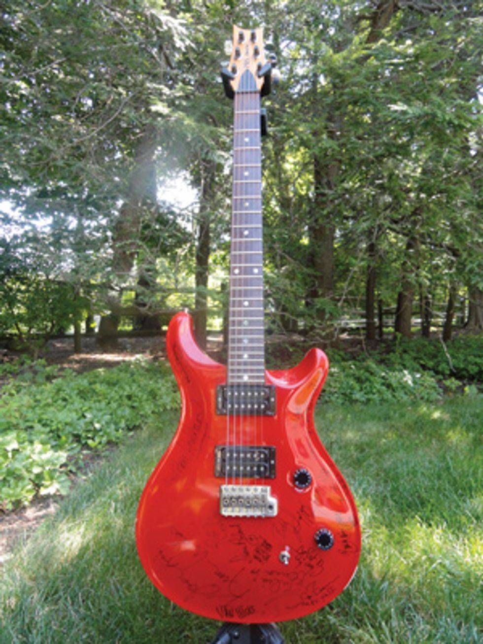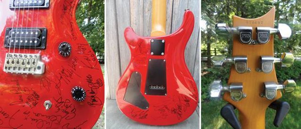 I clicked the link and up popped a series of pictures of a beat-up 1989 PRS CE as bright and gaudy as Thomas Magnum’s Ferrari—only after it’d been tagged by a bunch of Sharpie-wielding ’80s artists, including Julian Lennon, the Vixen vixens, the guys from House of Lords, Henry Lee Summer, and the ax-wielders of Molly Hatchet. Needless to say, the more affordable bolt-on model bedecked with celebrity autographs of yesteryear wasn’t quite a rare find of the sort dreamt about by your average guitar collector. But under the scribbles and blinding red finish I could still see that there was a (hopefully)nice vintage PRS guitar looking for a new home.