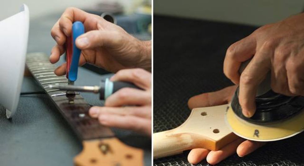 LEFT: A PRS Technical Center luthier removes the worn original frets. RIGHT: The back of the headstock gets its finish removed.
