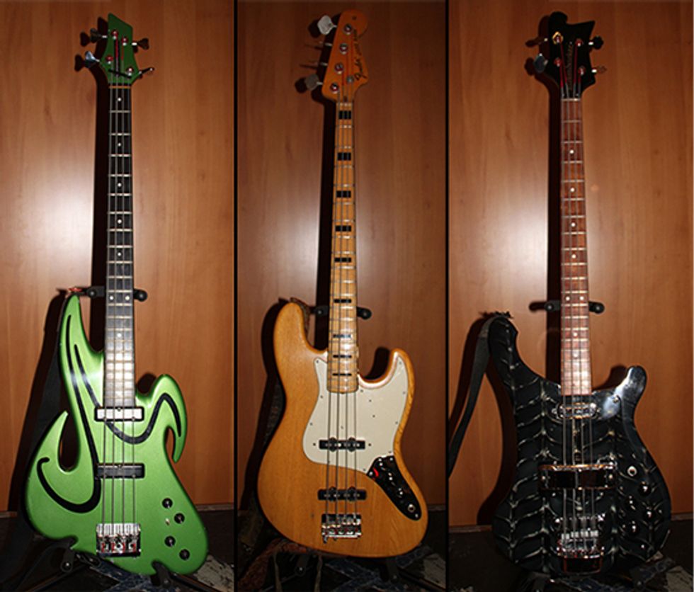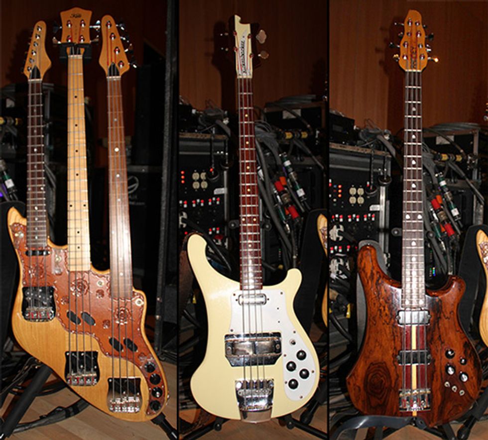 Chris Squire brought a number of basses on this tour, including a Kid’s Guitars replica of a Bob Wal triple-neck bass (left), which he uses on “Awaken” from Going for the One. Its 6-string top neck is tuned A–D–G (with octave strings for each), while the middle neck is fretted, and the bottom neck is fretless. In the middle is Squire’s legendary 1964 Rickenbacker 4001, which has powered “Roundabout” and countless other Yes classics. The 8-string Ranney (right)—which Squire plays on “Going for the One”—has a 5-piece body and active electronics.