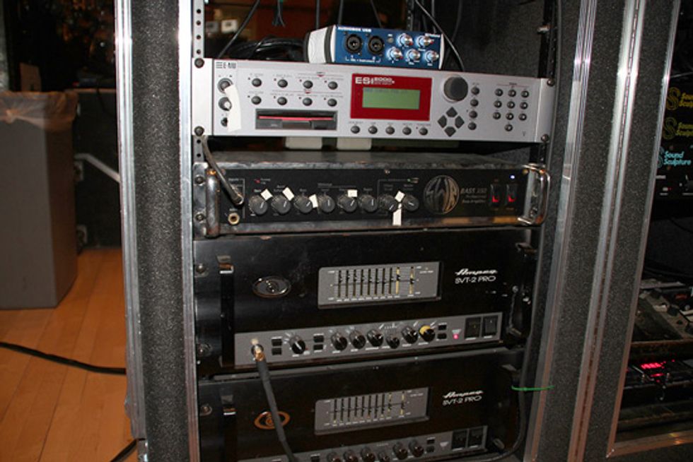 Squire blends his Marshall signal with one from a pair of Ampeg SVT-2PRO heads (bottom). An SWR Bass 350 head (middle) amplifies the Moog Taurus bass-pedal tones generated by his E-Mu ESI 2000 (second from top).