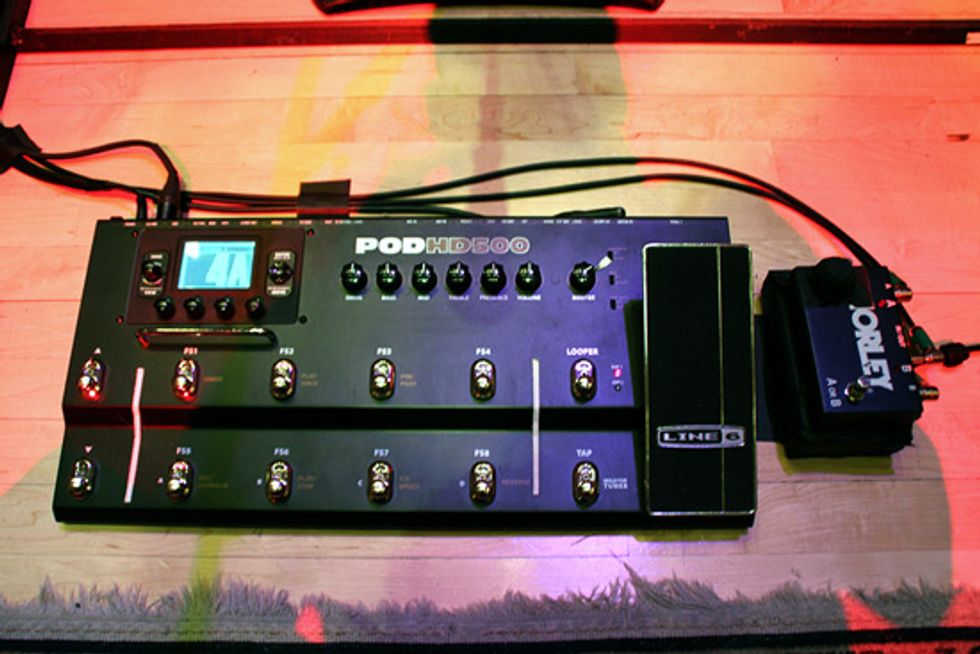 Howe and his tech have spent many hours programming true-to-the-record tones into his Line 6 PODHD500—his only effects device. He uses the Morley A/B pedal to switch between acoustic and electric guitars.