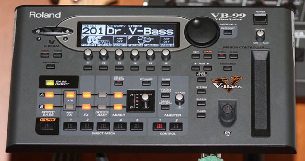Undaunted, Roland recently launched its latest bass synthesizer, the VB-99. Like the VG-99, the VB-99 is an updated version of an earlier system, in this case the Roland V-Bass. Modern Roland technology uses the GK-3B bass pickup, which easily fits to a variety of bass guitars, or third party piezo systems found in basses made by Brian Moore, Godin Guitars and others.
