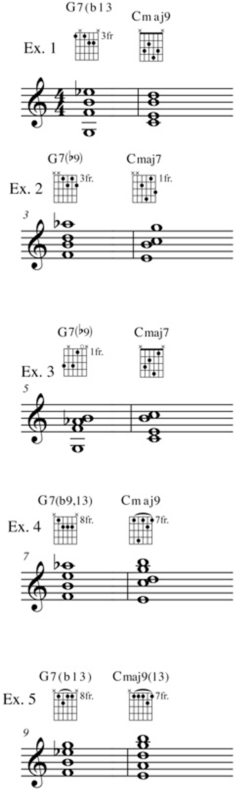 For extra fun, think about what else you could call some of these chords. For example, the G7(b9, 13) in example No. 4 could also be called a Db7(#9), or an Fdim(maj7).