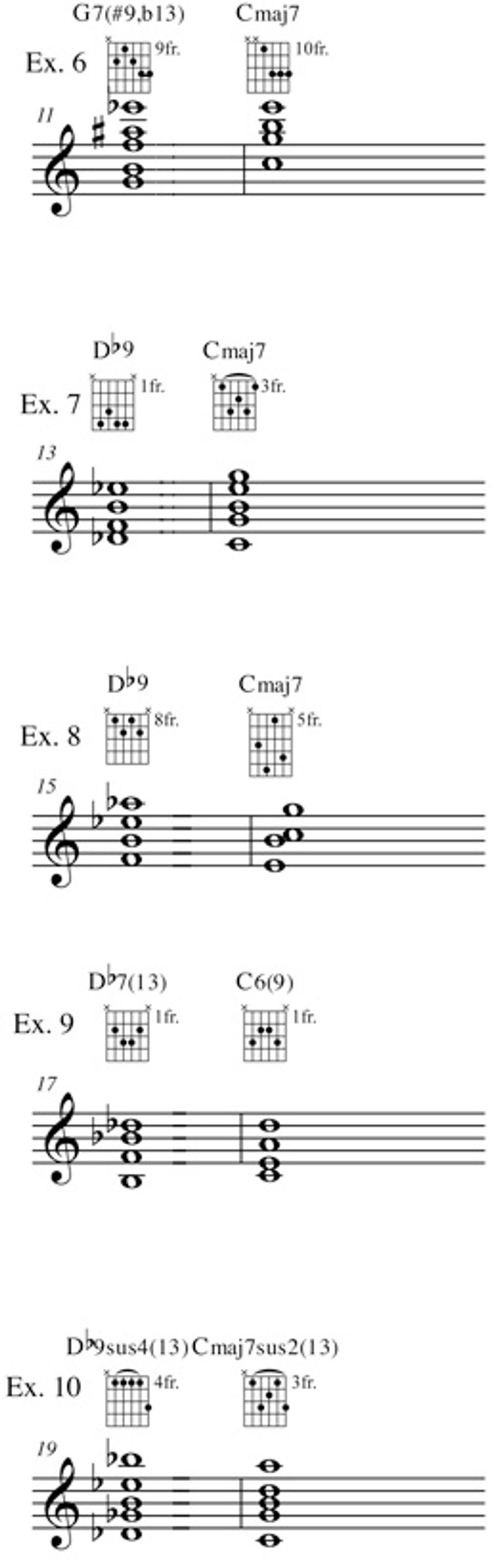 However, not all dominant chords resolve back to their I chord. Check the root motion. Sometimes a dominant 7 chord will move down a half-step, for example. That bII7 chord is a common substitute for a V7 chord. In that case, and any other dominant 7 chord that does not resolve to I, we do best to stay with natural tensions. Available natural tensions on dominant chords are 9, #11, and 13. (Examples 7–10 show some choices.)