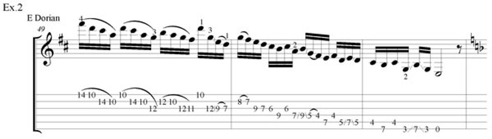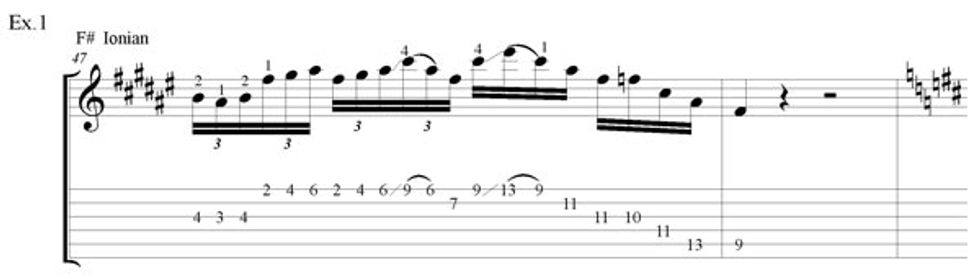 This first example is in the F# Ionian scale (F#, G#, A#, B, C#, D#, E#). This modal line kicks off with a little string skipping in the first bar and then an F# major, two-string arpeggio after a one-string triplet pattern. The line winds down in Bar 3 with a descending F# major 7th arpeggio (F#, A#, C#, E#).