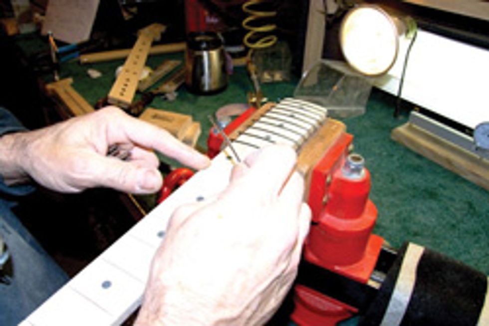 Once the bridge was secured, I placed the pickguard and control panel, moving them around until things looked good before drilling and screwing them down. Honestly, I tried not to be too anal during this process. I’ve seen plenty of old Teles that weren’t too hung up about being symmetrical, which is the same rough-hewn vibe I wanted this one to exude. Because the control plate came pre-soldered, wiring the butterscotch beastie up consisted of soldering a couple of leads from the pickup and the jack to the control plate assembly. I would love to say at this point that I strung it up and rocked harder than anyone has rocked before, but the truth was I still needed a nut. Luckily, my typically overbooked tech had a few immediate openings and I had my guitar back, strung up and ready to go three days and $75 later.
