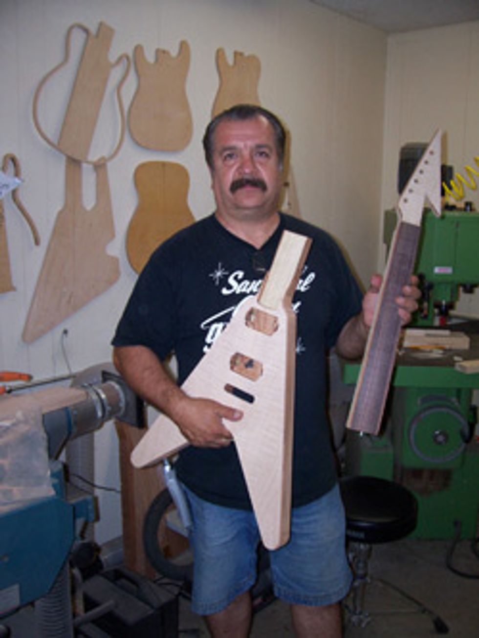 “I had to tell him that it’s going to be thick because 1 3/4" is the size of the block on the bridge,” says Sandoval. “A Strat body is anywhere from 1 5/8" to 1 3/4". An original Gibson Flying V isn’t that thick.” Control cavities would be placed on the upper wing for the pickup selector switch and on the outside edge of the upper wing for the output jack. Having cut the body out, the next procedure was attaching the Danelectro neck to it.