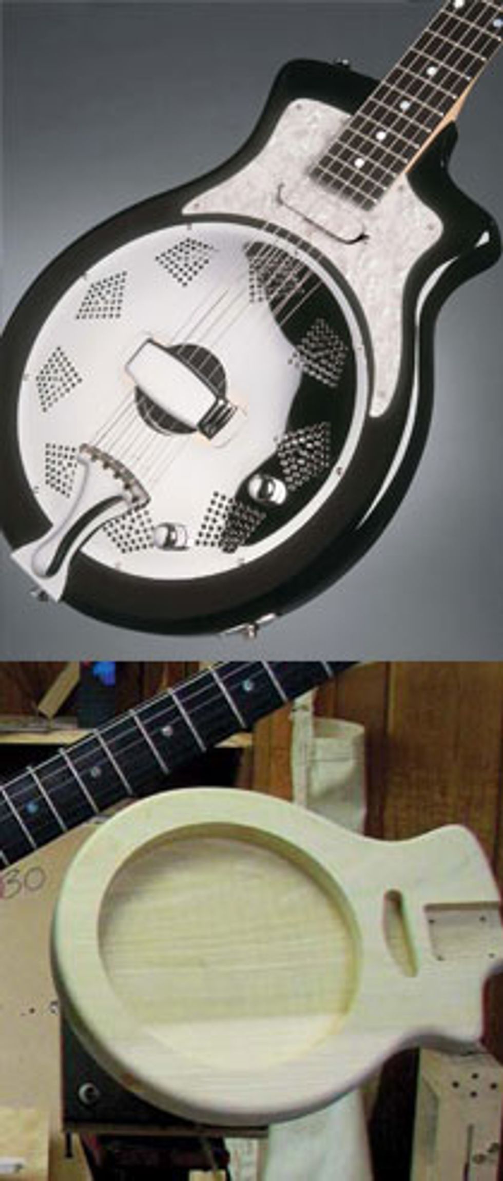 I was teaching a guitar-making class at a local college, and in every class I got to keep a guitar that I built. And my son was on the way, so I thought, “what could I do that would be a niche market and there’s not a lot of options for?” I just saw an opportunity to create what I thought would be a really superior electric resonator instrument that would be a fusion for regular electric players who want to get that reso vibe, and have it still feel like a normal electric guitar in their hands.