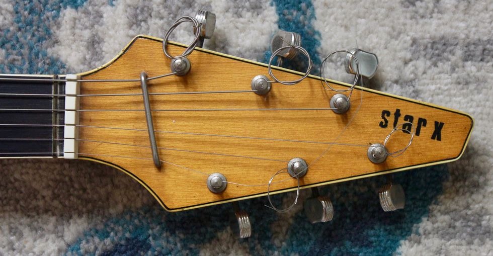 The offset body design (Photo 2) and triangular headstock (Photo 3) are something straight out of rocket science class. Even the pickup covers appear well thought out, and I appreciate that level of detail. This model must have been a total trip for the aspiring Soviet guitarist, though I imagine the Star X was out of reach for little cosmonauts. But the Spiders from Mars? That’s a different story.
