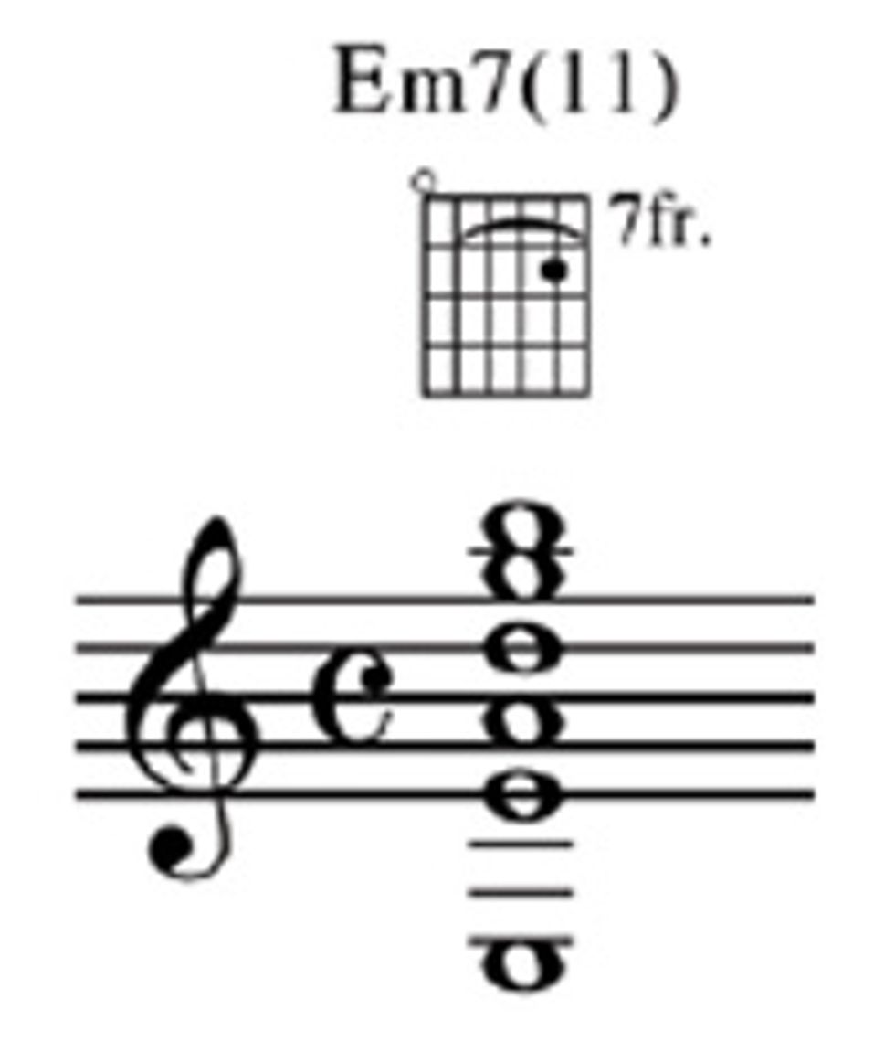 Here’s a chord form that may be familiar. Play all six strings and listen. Sounds like some sort of Em, right? The chord form is similar to what we could play as an Em7 with the root on the 5th string. To find its proper name, let’s first identify each note in the chord. From low to high, including the open E (6th) string, we have E E A D G B. Now, let’s look at how each note functions in the chord: E is the root, so we can use the open E string and also the E an octave higher on the 5th string. A is the 4 or the 11 (we’ll come back to that). D is the %7, G is the %3, and B is the 5 of an E chord. We have the root, %3, 5, and %7, so we can quickly see an Em7 emerging. Now we can come back to that A, and see that it is functioning as a tension in this case, a note that is added after the 7th for extra color and interest. All together, that gives us Em7(11).