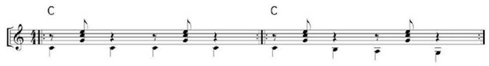 C chord to get into it. There is a bass note on each of the four beats. Start by just playing the chord on the “and” of beat 1 and then try adding