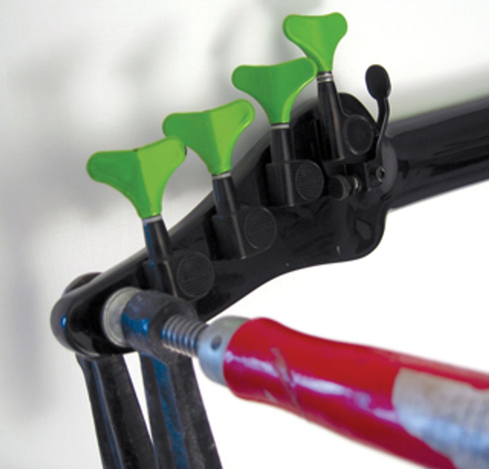 This simple model tells us that one way of getting rid of a dead spot is to get a stiffer neck, which is why stiffer composite necks are less known for dead spots. Adding mass to the neck—especially to the headstock— is another way to lift resonances. If you’re dealing with a dead spot, try this DIY experiment: Temporarily affix a clamp to the headstock to change the neck’s mass (Fig. 1). Changing to heavier or lighter tuners can also shift a neck’s resonance. Because they react to their multiple higher modes, these resonances will also work their way through the entire midrange.