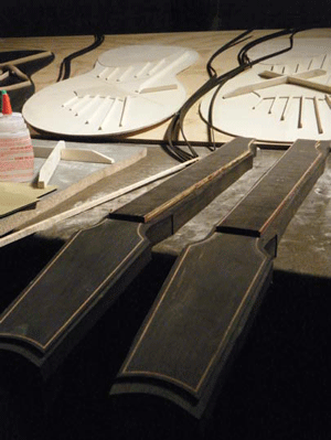 Well, before the fingerboard goes on, the whole neck is hollowed out. Again, kind of like honeycomb, so there's some structure there. And the body is semi-hollow, so the sides are bent like an acoustic. And the top and the back are one chunk of ebony that's shaped by hand. So it's a heavy guitar, but no heavier than a Les Paul.