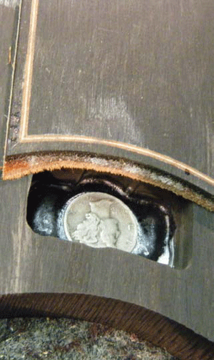 | The Strolling with Bones acoustic Parsons built for Page features a Sitka spruce top with Kasha-style bracing and an ebony neck (left) and an embedded silver “spell coin" the luthier has had since childhood (center). “I figured it couldn't hurt," he says. Bones' interior is supported by four flying braces tied together with waxed leather (right). | ||
