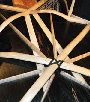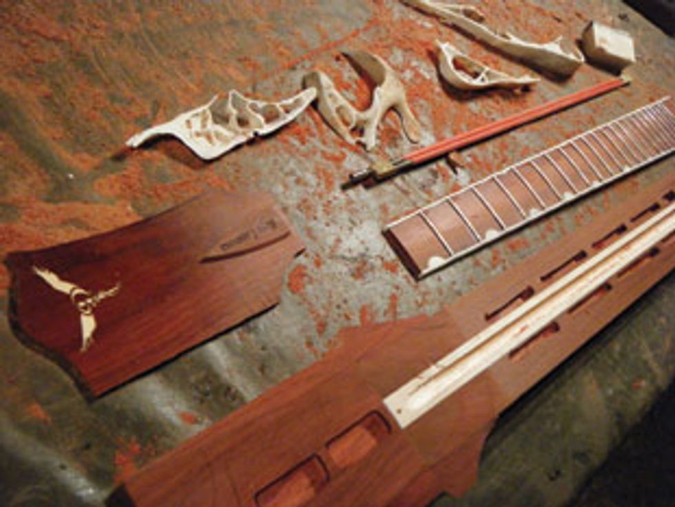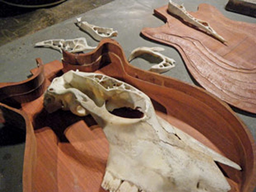 Bone is just such a perfect material. I use the skull for interior bracing, and because of its honeycomb construction it's very lightweight and super, super strong. We've got these dead skulls sitting in the desert just being wasted, and I'm going to chop them up and use them for braces. It just makes sense. Tonally, they're great. They look cool, and it's a great resource. I do a lot of other things, as far as being green—I recycle materials you would never think of instead of buying new stuff or chopping down trees. Ultimately, I use these items because nothing competes with nature.