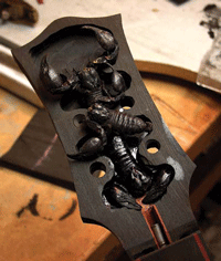 ![]() The Black Vampire was built entirely of Gabon ebony for Microsoft co-founder Paul G. Allen. Its headstock is adorned with intricate scorpion carvings, and the back of the neck is inscribed with secret writings that are only visible under a black light. |
