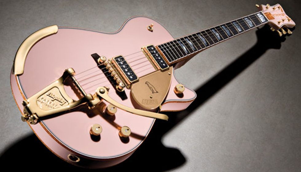 ![]() This first Gretsch Custom Shop guitar, a Pink Penguin with Bigsby tremolo, was master-built by Stephen Stern for Boz Boorer, guitarist and musical director for Morissey. Photo courtesy Fender |