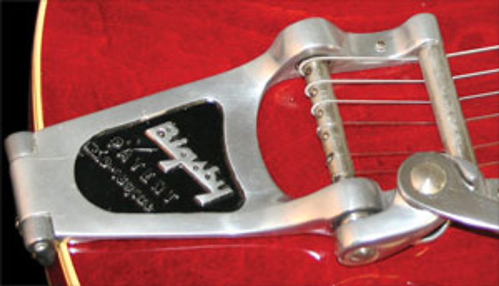 This tremolo takes little effort to use, and the arm has a limited range of downward travel. An inability to return to pitch accurately and a thinning of the tone, however, are inherent characteristics on the original Bigsby. A design revision shows a retainer bar preceding the strings’ travel to the bridge, creating a sharper break angle to increase sustain, which was a good thing. The revision also added more pressure on the bridge to couple it to the body more substantially, which increased the resonation factor, but resulted in the problem of friction at the bridge saddles.