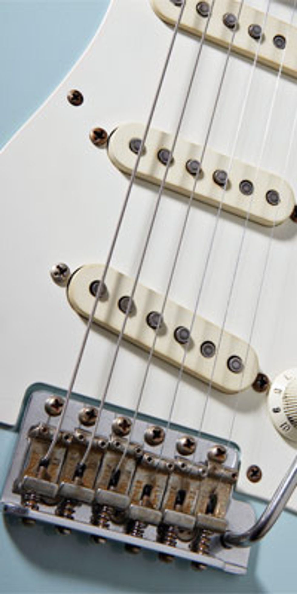 The Fender tremolo was a feat of engineering. It is attached to the guitar both externally and internally, as a single assembly. This tremolo bridge consolidated the tailpiece and bridge into a single unit that pivots off six screws. The baseplate of the tremolo is mounted to a steel sustain block with a considerable amount of mass. Six bent nickel-plated bridge pieces are anchored to the baseplate and are adjustable to intonate each string more accurately. One outstanding feature in the Fender tremolo bridge is the ability to adjust the height of each string— something that could only be done previously with two screws on the treble and bass sides of a guitar’s bridge. The arm screws into the baseplate and continues into the sustain block, making the assembly move as a whole. With the strings tuned, the bridge is counterbalanced by three to five springs, anchored by a claw inside a cavity routed in the underside of the body. These springs pull the sustain block backward while the strings pull the whole bridge forward. It is a balancing act. This is what makes the Fender so much more responsive to the touch of its tremolo arm. The Fender tremolo was also easier to comprehend, because it was self-contained. The strings are threaded through the sustain block to the saddles. Because the strings are coupled with the steel sustain block and pivot from the six bolts screwed into the wood of the body, there is a more substantial tone compared to the Bigsby. The Fender tremolo also has a further travel, and was designed to have upward as well as downward movement. The tremolo arm has a stiffer feel and is much more responsive to the touch. As cool as that design is, though, there are some inherent problems.