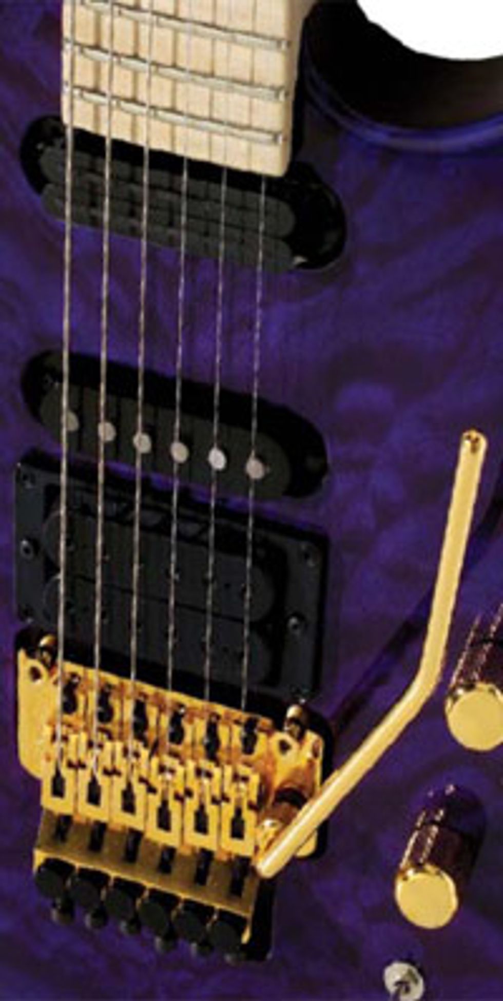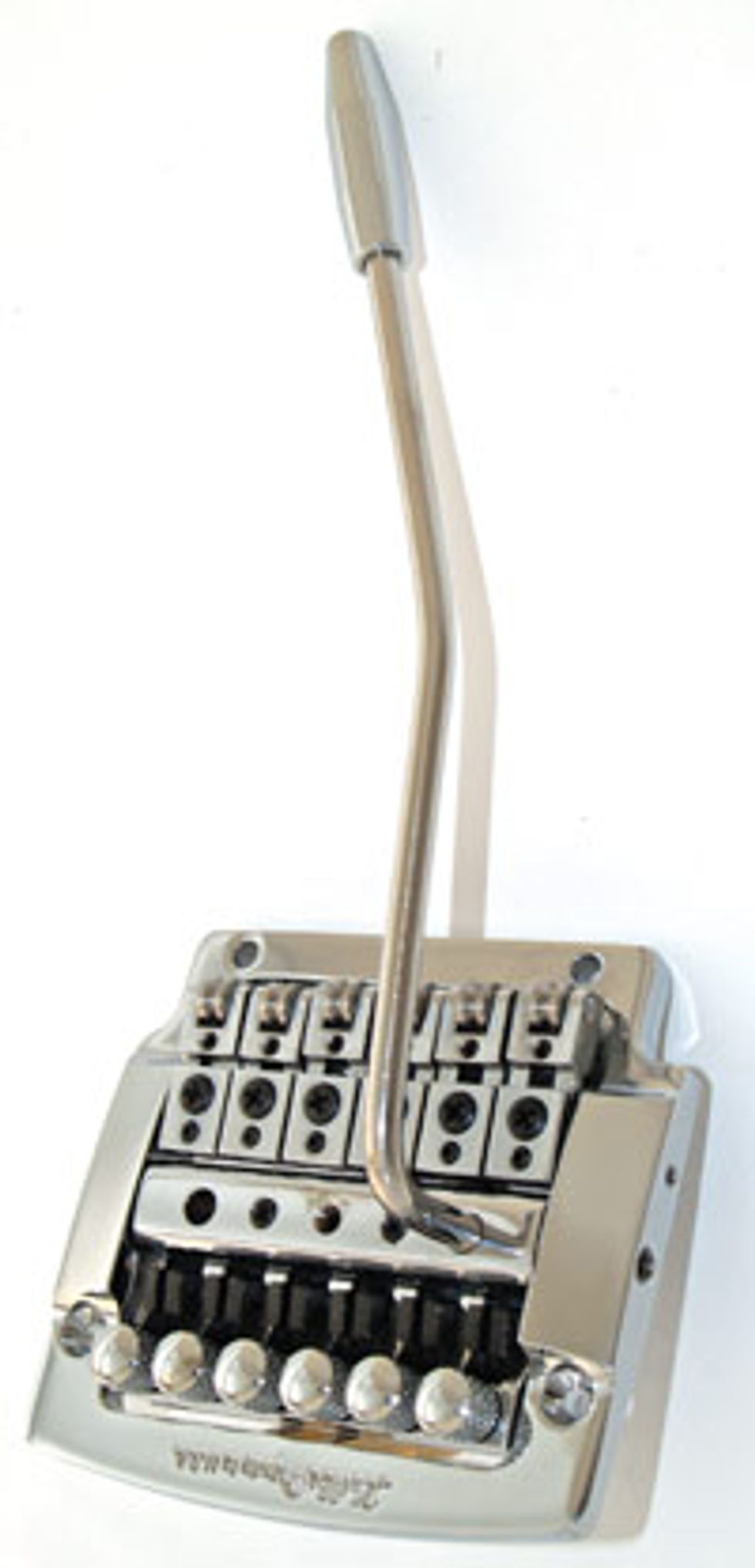 The shortcomings of the Floyd Rose are minimal. Unlike the Fender bridge, the Floyd Rose bridge doesn’t have individual string height adjustments. This adjustment is important to follow the radius of the neck. The six saddles of the Floyd Rose have three compensated heights: the highest two are positioned for the G and the D strings, the middle height for the B and A strings, and the low-height saddles for the high and low E strings. Although this makes a good approximate arc, it is not conducive to accurately adjusting the action to match the radius of the neck. Shimming the individual saddles is the only solution to fine-tuning a radius match with the saddle heights.