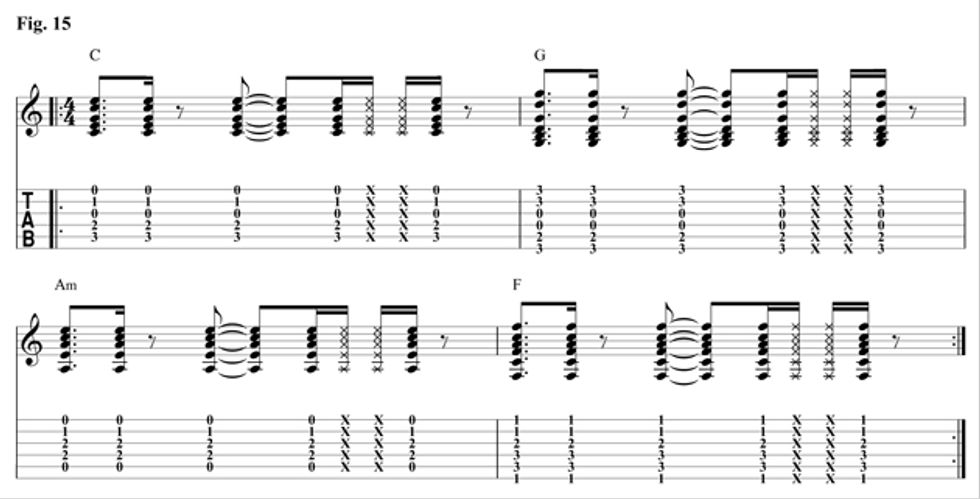 Things get even busier in Fig. 12, where we play a more British-inspired riff. Keep an eye out on the strum patterns in the second measure—they're the key to getting the feel right.