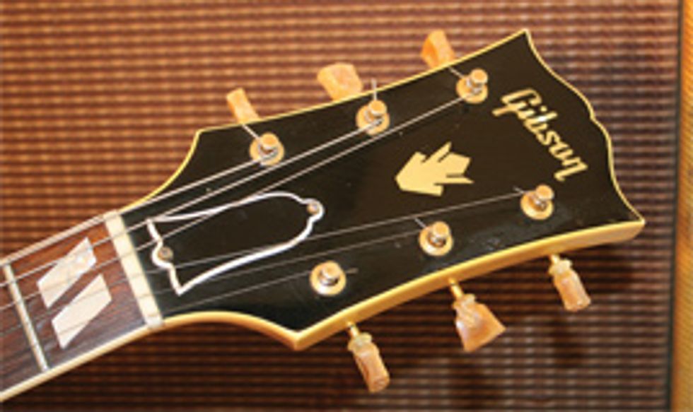 The stunning example shown here was made in 1958 and is one of only 43 natural models made that year (the other 104 were sunburst). This guitar sports the Patent Applied For humbucking pickups that became standard equipment on the model in 1957. It is also adorned with an attractive, but non-stock Bigsby vibrato tailpiece, instead of the W-shaped original.