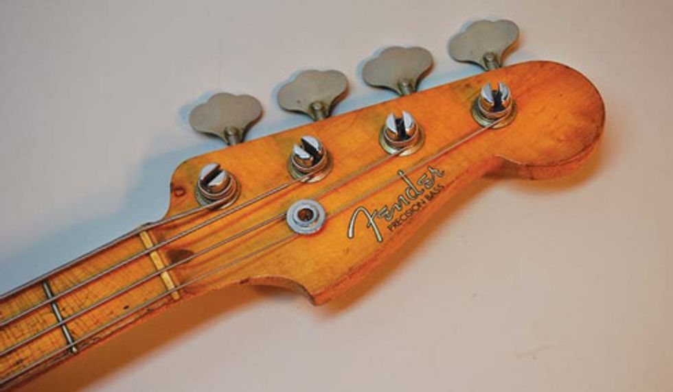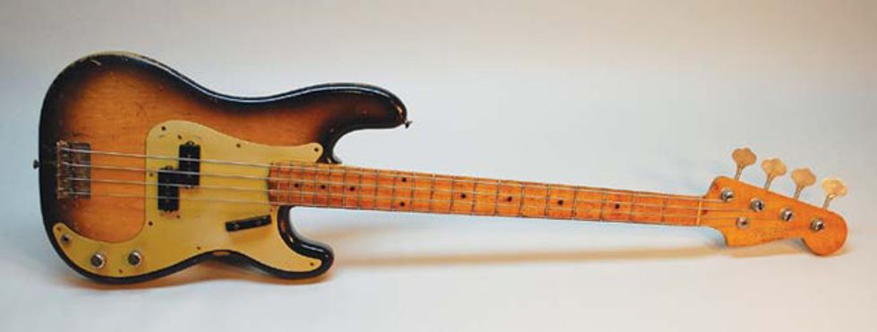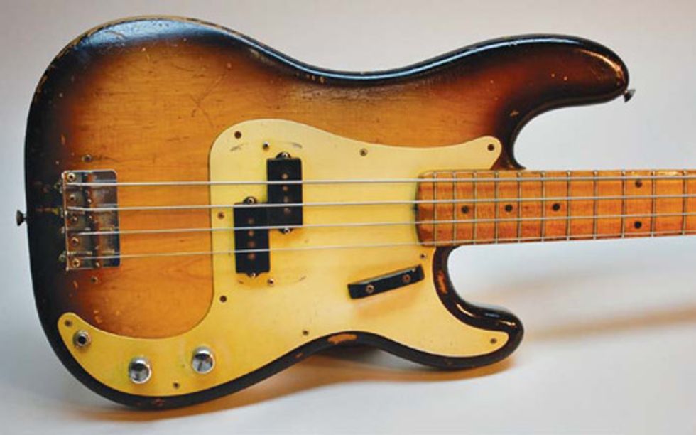This particular 1958 P Bass is 100 percent original and is said to have been used onstage with Boxcar Willie’s band and by rockabilly legend Eddie Cochran’s bassist Connie ‘Guybo’ Smith [see inset photo]. 1958 was a year of transition for the P Bass. And many features and appointments were only seen together for one year because of the many alterations the P-bass saw between ’57 and’59. The contoured, second generation body has a two-tone sunburst finish that was discontinued in May 1958, while its one-piece maple neck and fingerboard was replaced in mid 1959 by a maple neck and rosewood fretboard combination. This instrument also sports the gold, anodized aluminum pickguard of mid ’57 to late ’59 and the P Bass’ signature split-coil pickup—a humbucking design that’s connected in series but magnetically inverted (N/S-S/N)—though in this case it uses raised-A pole pieces that were discontinued and made flush in 1959 production models.