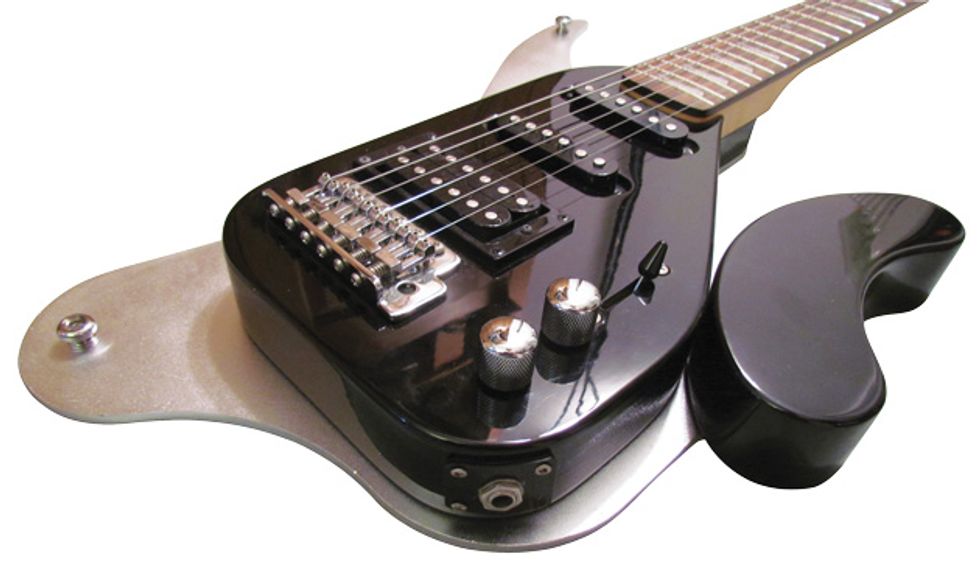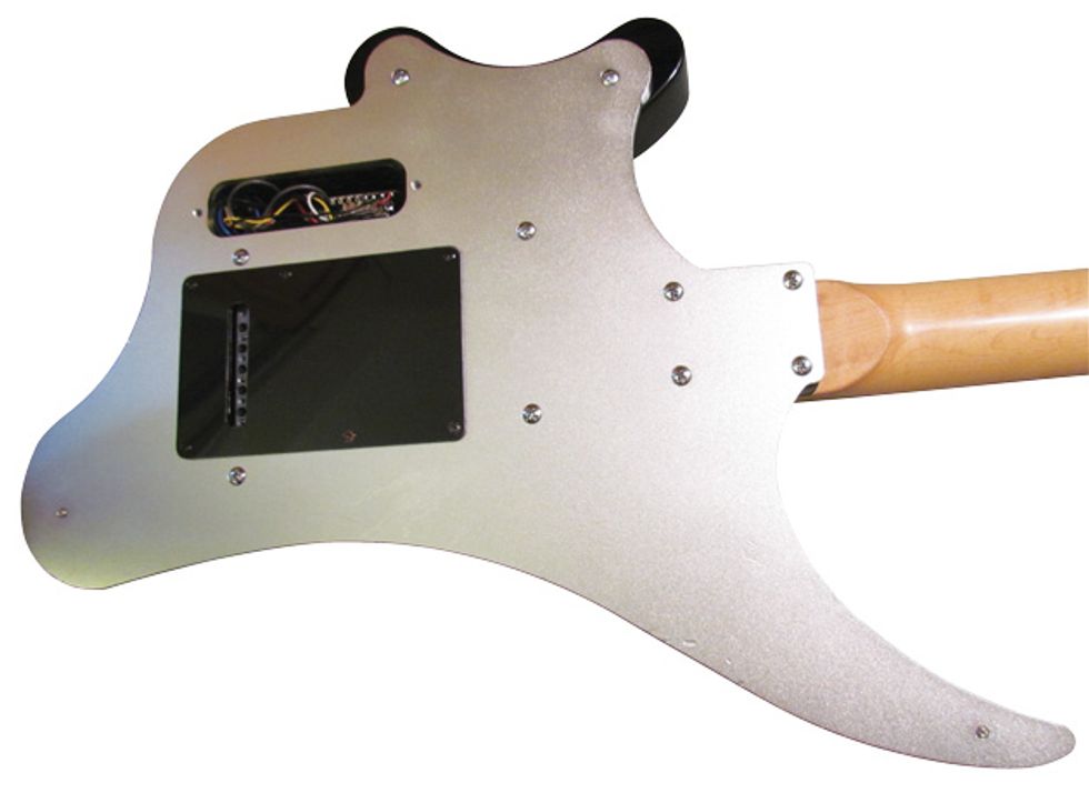 In person, the Stiletté Futuré has an unusual 3D look that pictures don’t do justice to. You can tell someone wanted to design a futuristic guitar here—but then got distracted by reality. It features two Strat-type single-coil pickups, a humbucker in the bridge position, an upside-down headstock/tuner configuration, a rosewood fretboard, and scallop fretboard markers. But the most unusual aspect is the silver-colored flat aluminum back. A black plastic housing and knee rest sits atop the aluminum, creating visual contrast.