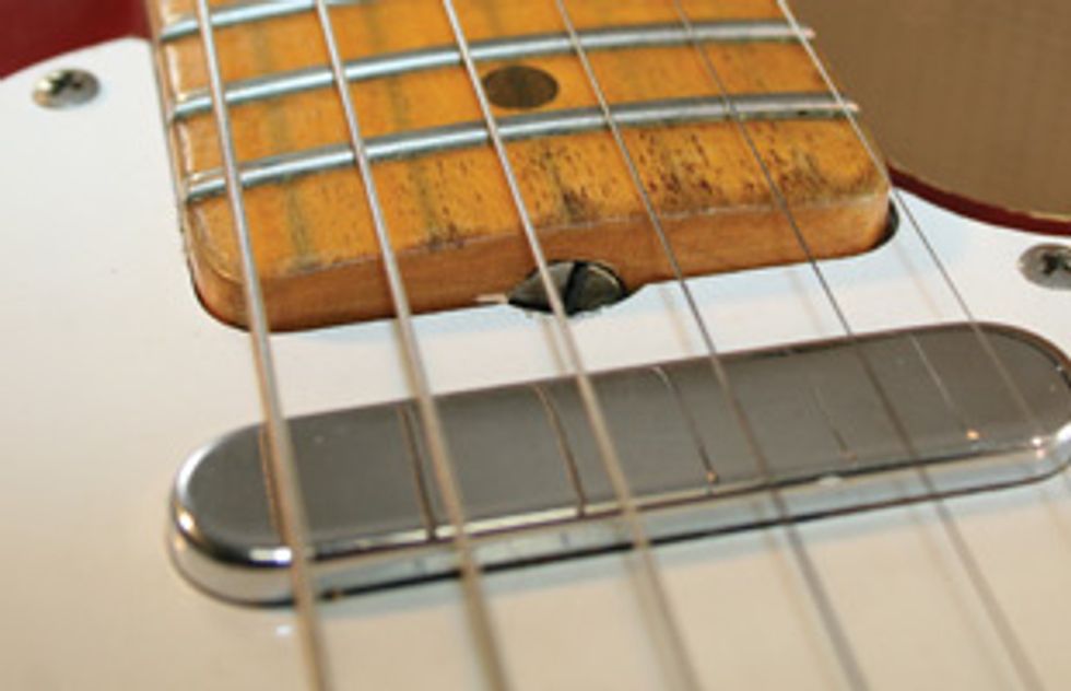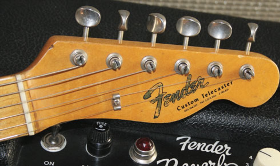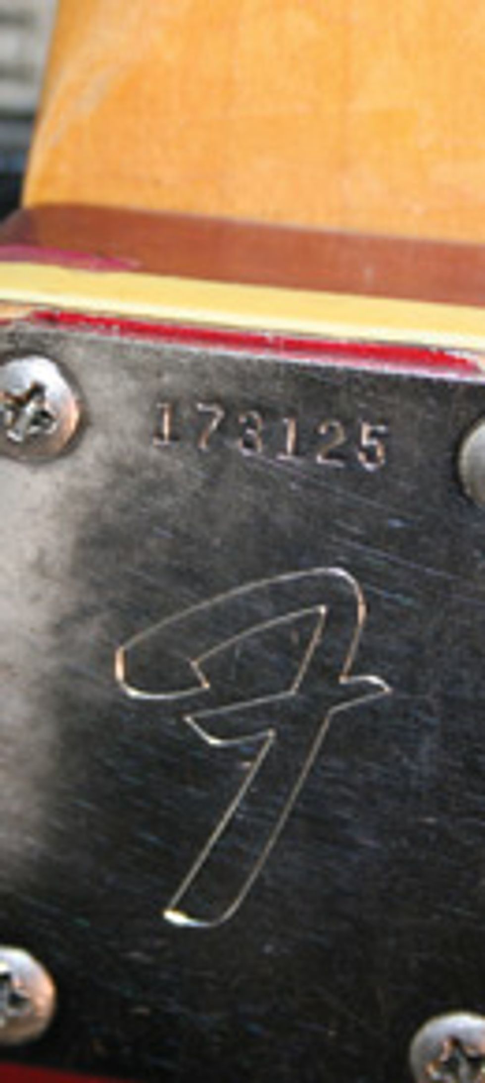 This month’s featured Telecaster Custom has details common to most Teles of 1966: “double line” Kluson Tuners, “F” stamped neck plate, three-ply white pickguard, “Pat. No” bridge with threaded steel saddles and gold “Transition” Fender logo. Just being a 1966 Telecaster Custom makes this a rare guitar, but adding the maple cap fingerboard (rosewood was standard) and the Candy Apple Red finish (Sunburst was standard) makes it ultra-desirable. The heavy fingerboard wear showcases the shortcomings of the Nitrocellulose lacquer finish used by Fender until 1968. The body wear allows the undercoat of metallic gold (silver was used from 1963 to 1965) to show through. Finally, science fiction fans may be interested to know that the stamped neck date of September 1966 coincides with Star Trek’s television debut.