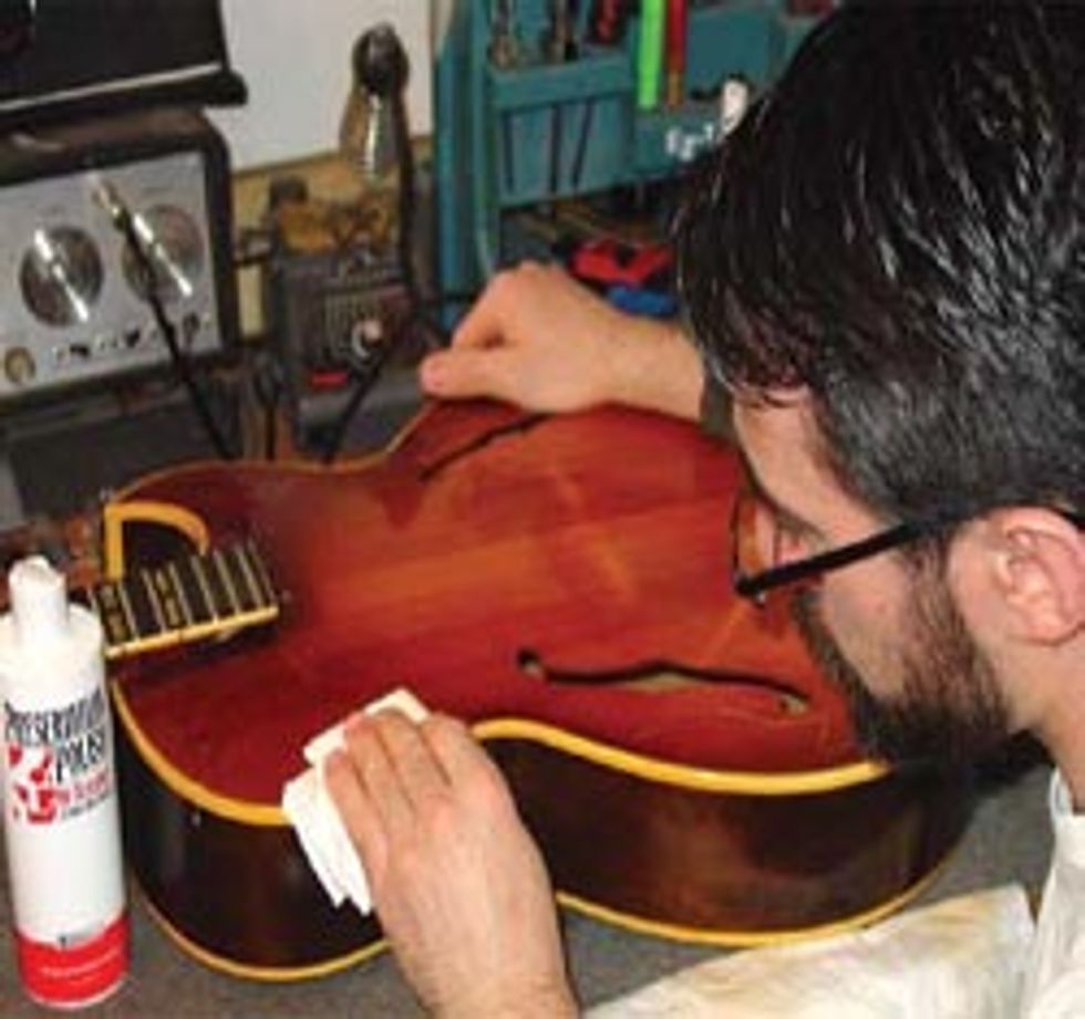 For this project I, wanted to try out the new Preservation Polish from Stew Mac. Ordinary guitar polishes shine by leaving a long-lasting silicone residue that’s very hard to remove. If your guitar ever needs a repair, the silicone will prevent glue or finish from adhering, making even simple repairs more difficult and costly. Preservation Polish gently cleans, polishes and protects lacquer and varnish finishes, with no wax or silicone residues.