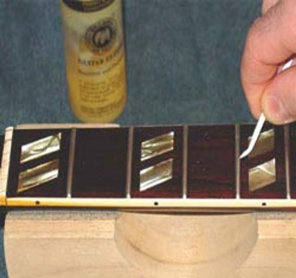 Before the very final stage of polishing, the fingerboard and frets were lightly washed with 0000 steel wool. BGF Guitar Elixir was then applied and left on for a few minutes while we used a drop-fill toothpick to help loosen the years of debris on the edge where the fret meets the fingerboard. A paper towel was used to absorb the dirt and Elixir, and then a second and final treatment was applied. I really like those handy, angled plastic toothpicks, as they have many uses around the shop.