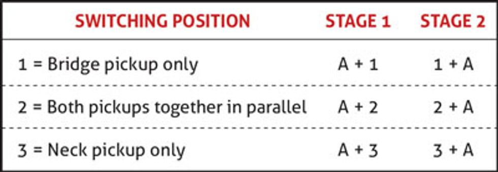 The standard Tele wiring schemeis shown in Fig. 5. The blue connections are permanent jumper wires. Notice the connection between the #2 lugs of stage 1 and stage 2. This is where the two stages are connected, and it's the key to engaging both pickups together in parallel in the switch's middle position.