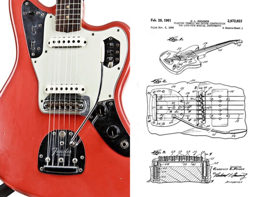 Though the Fender Strat’s “Synchronized Tremolo” from 1954 is arguably the most-used vibrato system in the world (see the U.S. patent diagram at right), in the ’60s far more players were using the trem found on the company’s Jaguar (left) and Jazzmaster guitars. Photo by Tim Mullally