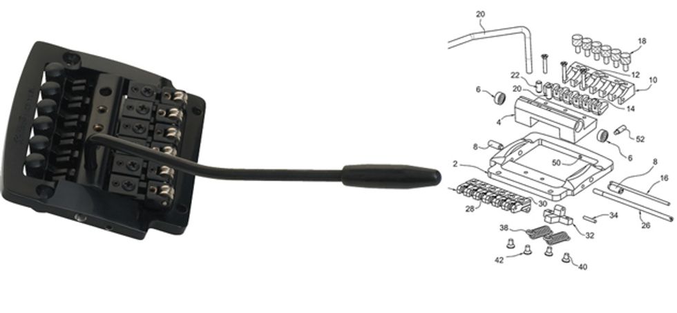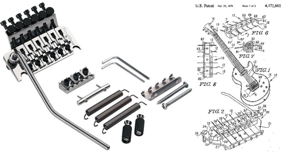 A set of Original Floyd Rose trem parts (above left, photo courtesy of Banzai Music) and part of the original 1979 U.S. patent diagram filed by Rose on October 23, 1979 (above right).