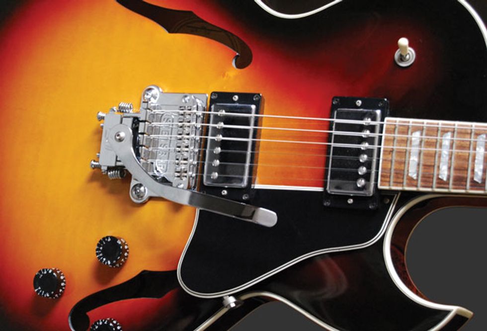 Bigsbys are often found on hollowbody and semi-hollowbody guitars because the vibrato mounts to the guitar’s top and is less physically invasive than other systems. The Bigsby’s spring-loaded rocker arm attaches to a pivoting axle that the strings wrap around. The pull of the strings works in conjunction with the pressure of the spring. When the arm is pushed down, the bridge rocks forward and the strings loosen, lowering their pitch. When pressure on the arm is released, the strings return to pitch.