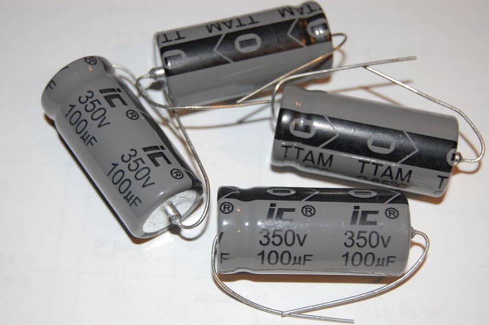 For an alternative to 100 µF 150V caps (Fig. 2), consider the more readily available 100 µF 350V caps (Fig. 3) from such suppliers as Mojo Musical Supply. They should fit fine and work well. (It might be more difficult to find slightly higher capacitance values such as 125, 150, or 200 µF, as these are relatively uncommon values.) I hope they give your Silvertone a killer tone!