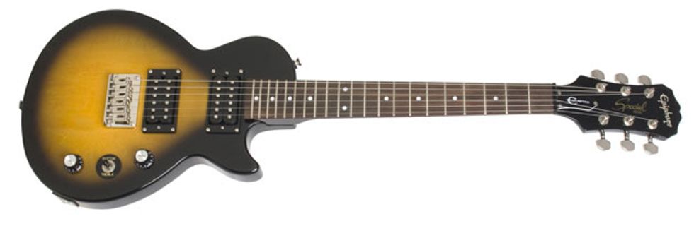 The LP Express is another new design from the House of Stathopoulo featuring the trademark curves of the Les Paul--the most famous electric guitar in the world--made smaller for younger players and easy travel. The LP Express comes with an all-Mahogany body with a bolt-on Maple neck, a full-size neck with 22” scale length, Rosewood fingerboard, and a flush-mounted, 1-piece fully adjustable bridge and tailpiece combination. The LP Express is voiced by two Epiphone designed ceramic humbucking pickups, a 650R in the neck position and a 700T in the bridge. The LP Express comes in both Ebony and a Vintage Sunburst color finish.