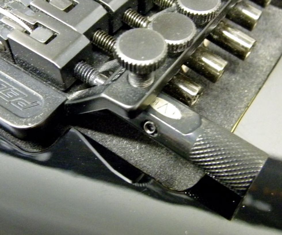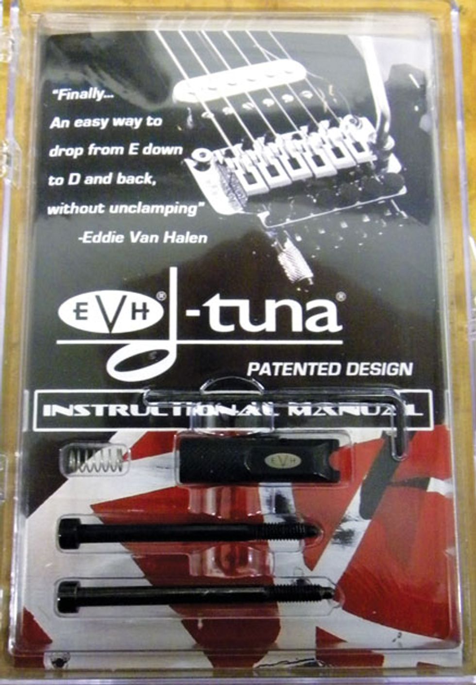 D-Tuna details. The device works with standard electric string sets and in either concert or Eb tuning. (In the latter case, the dropped 6th string goes to Db.) The kit includes two locking screws of different lengths; this allows the D-Tuna to work with most Floyd Rose or Floyd-licensed double-locking trems, such as the Peavey unit in Photo 2. Once the spring-loaded device is installed, you simply press it down to drop the low E string to D. To raise the 6th string to E again, push the D-Tuna towards the bridge—it’s that simple.