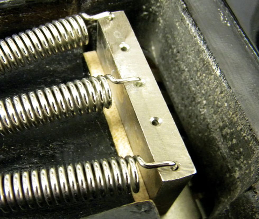 The best way to do this? Carve a slim wooden shim to position between the Floyd’s inertia block (where the springs attach to the trem system) and the edge of the spring cavity. I like using maple for this because it’s so durable. The tools are simple—you can use a small hobby saw and a belt sander or a few sheets of medium and fine sandpaper—but it takes time to measure, cut, shape, and fit the shim, so be patient.
