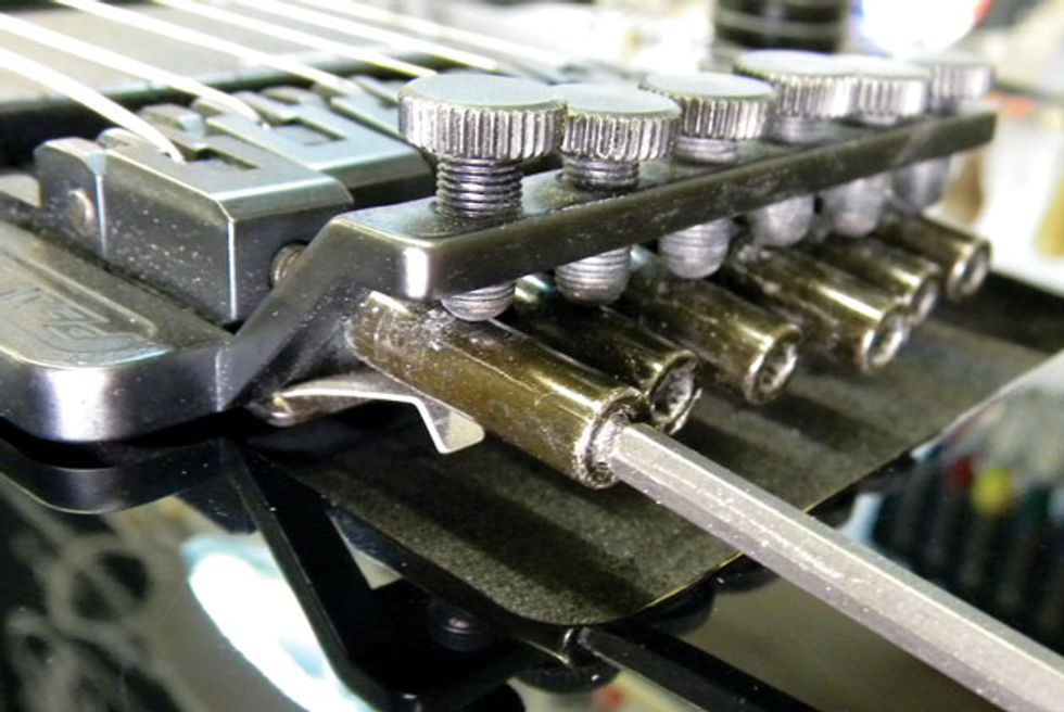 Adjusting intonation. Next, use a high-quality electronic tuner to check the 6th-string intonation at the 12th fret one more time. In fact, I like to check the 12th-fret intonation with the string first tuned to E and then retuned down a whole-step to D. If the fretted note is sharp relative to the 12th-fret harmonic, move the saddle back (away from the neck). Conversely, if the fretted note is flat compared to the harmonic, move the saddle forward. Most Floyd Rose systems use a 2.5 mm hex key to unlock the saddle’s set screw.