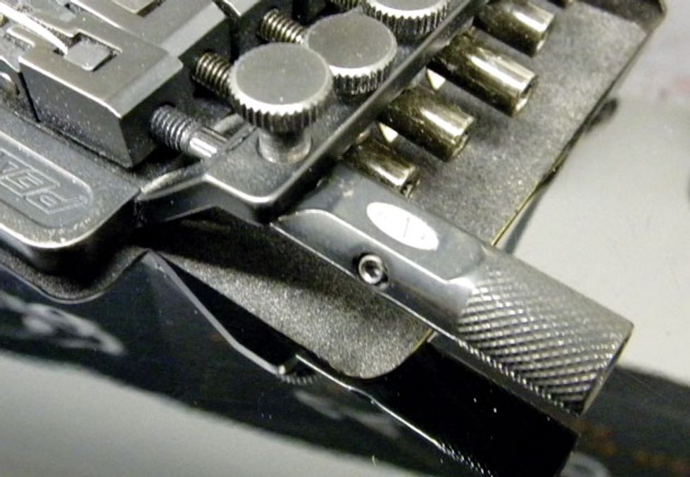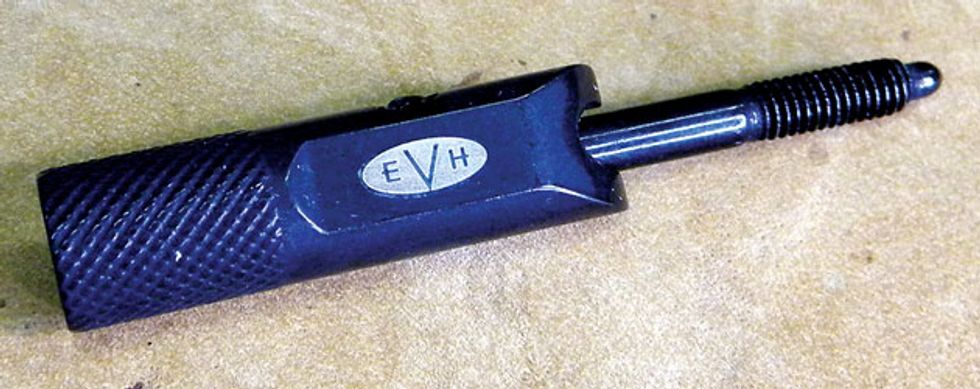A few months ago one of my favorite clients brought in a very cool project. He wanted me to install an EVH D-Tuna (Photo 1) on his Floyd Rose-equipped Peavey V-Type Limited Edition. Designed for double-locking tremolo systems, the D-Tuna lets you quickly lower your bottom E string a whole-step to D without having to unlock the string nut, retune, and then lock the nut again. Now that’s handy!