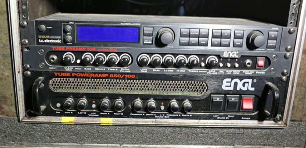 To cover cabinet or power amp failure, a signal from the TriAxis also goes through a Lexicon MPX G2 and BBE Sonic Maximizer for some sweetening, then into a Mesa/Boogie Stereo Simul-Class 295 power amp (which Derks has taken on the road since 1990), and finally a rackmount Palmer PDI-03 Speaker Simulator.