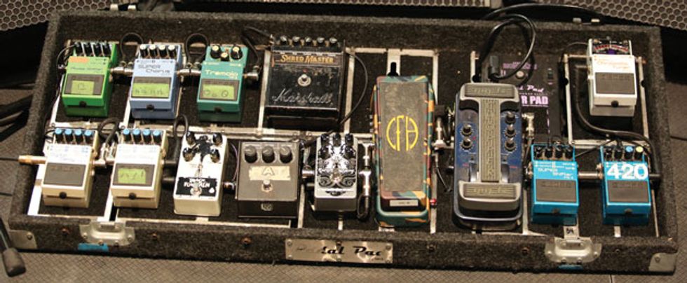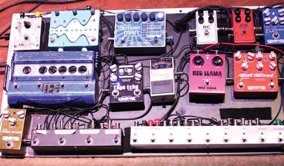 Jesse Lacey, vocalist/guitarist for alt-rock outfit Brand New, did all the wiring and soldering on his pedalboard. When his signal first hits the board, an L.R. Baggs Para Acoustic DI sends a signal to the front of house. Another line runs into a GigRig Pro-14 switching system, which routes the signal to a Crowther Audio Hotcake overdrive, a modded MXR Blue Box, a Fuzzrocious Zuul, a BYOC Large Beaver, a Walrus Audio Voyager, an Old Blood Noise Endeavors Black Fountain, a TC Electronic Corona, a Mr. Black DeluxePlus, a Dr. Scientist Radical Red Reverberator, a Smallsound/Bigsound Buzzz, a Boss DD-6 Digital Delay, and a Boss TU-2 tuner.