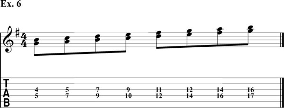 To get us started I’ve tabbed out a G major scale (G-A-B-C-D-E-F#) played on one string (Ex. 1).