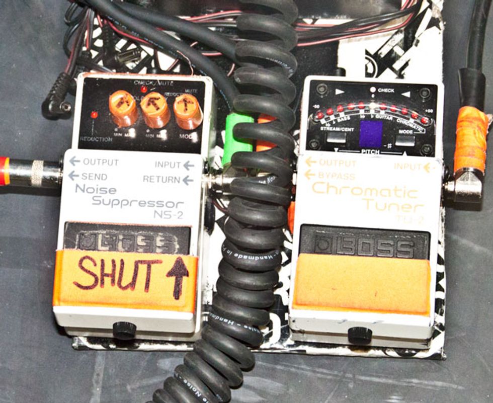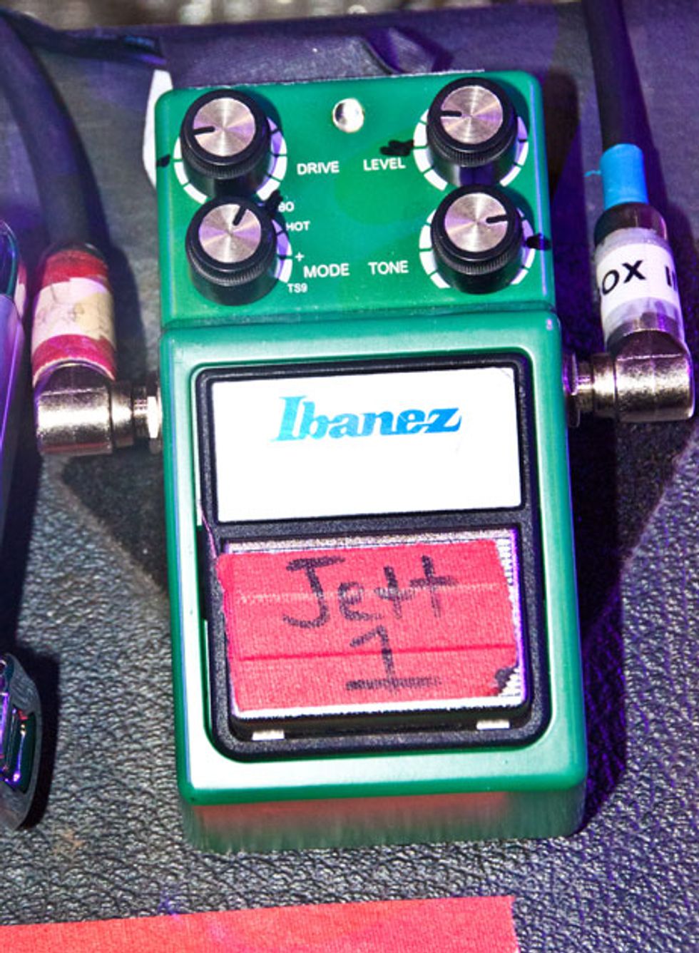 Jett’s primary guitar for most of her shows for the last 20 years is a battered and sticker-bedecked Gibson Melody Maker with a single Red Rhodes Velvet Hammer humbucker. A black-finished 2011 signature Melody Maker with a Velvet Hammer that was a gift of the late Brian Farmer (guitar tech for Warren Haynes) serves as yet another backup. The volume knobs on all her guitars are wrapped with the hooked side of a piece of Velcro to increase their grip-ability, and each instrument features D’Addario .010–.046 string sets. Nagy says that a big part of Jett’s sound comes from using the broad, serrated edge of her D’Andrea Delrex Sharkfin 1.0 mm picks.