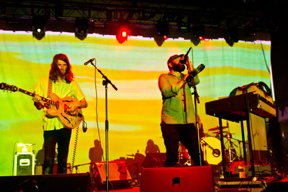 The Black Angels’ sound remains true to the early days of experimental psych, and you’d be hard pressed to find an instrument onstage that wasn’t built prior to 1968—or at least reissued as such. Guitar duties are chiefly handled by the group’s pair of left-handed players: Christian Bland, who favors a 37-year-old black Rickenbacker 345 (which was sadly destroyed by United Airlines shortly after the festival), and Jake Garcia, who used a Kurt Cobain Fender Jaguar for most of the set.