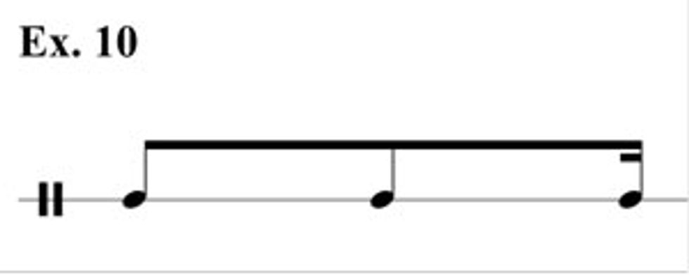 Play through the melody using this rhythm (Ex. 9). Notice that in this case, there are 21 notes, so playing them in groups of three in this rhythm produces a repeating seven-beat version of the melody.